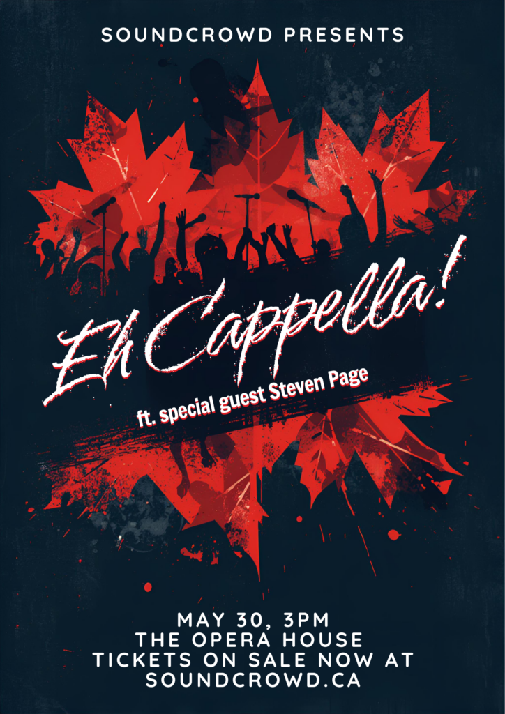Saturday May 30, 3pm. The Opera House. SoundCrowd presents: Eh Cappella! An all-Canadian a cappella extravaganza with original performances of songs by The Guess Who, The Weeknd, Avril Lavigne, Alanis Morissette, Céline Dion, Nelly Furtado, Bryan Adams and more.